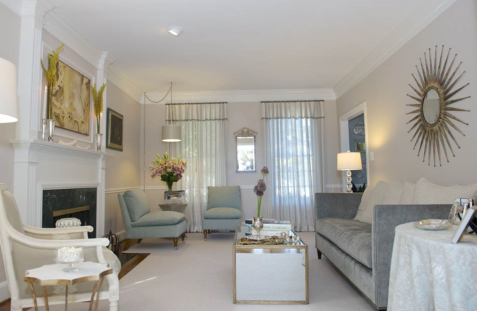 This recently married couple had only lived in this home for 16 months when it was time to plan for their first baby's arrival - PA was the code name! A nursery for a "Princess" had to be designed, and other rooms completely reinvented, and some just needed "finishing." The living, dining, and family rooms were all reinvented, plus an office, two guest rooms and a powder bath were brought to life. The Mrs. of the household has fuchsia as her favorite color, layered with grays and bold blue tones, so this drove our inspiration throughout.